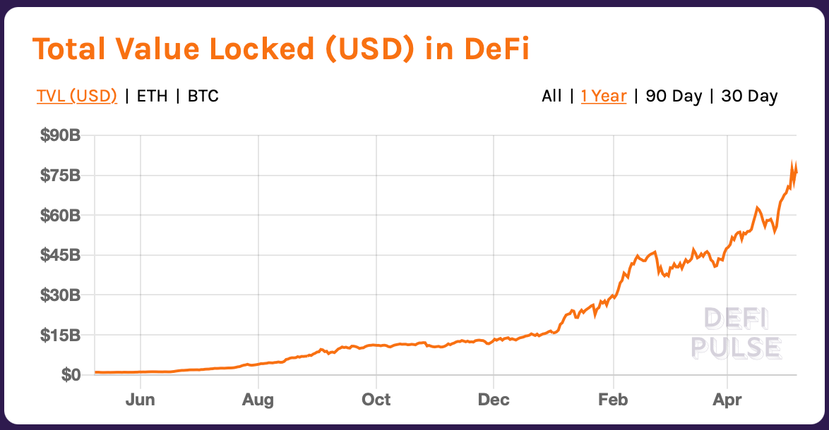 Finance is where there is the biggest action; Projects building futures markets, insurance systems, synthetic asset trading or lending and borrowing are gaining popularity and are seeing a rapid inflow of capital. According to DefiPulse there are currently 50B USD locked in the various dapps (decentralised apps) of the Ethereum ecosystem. And if you just look at the 1 year chart, this has all happened quite recently (and dumped a good bit even more recently):