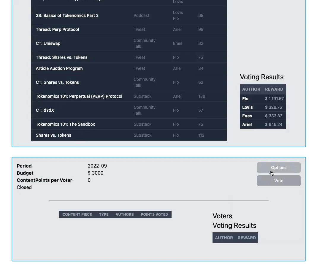 Per content piece, every contributor gets 10 points to vote. E.g. 15 articles, threads, podcasts etc. will give everyone 150 points.